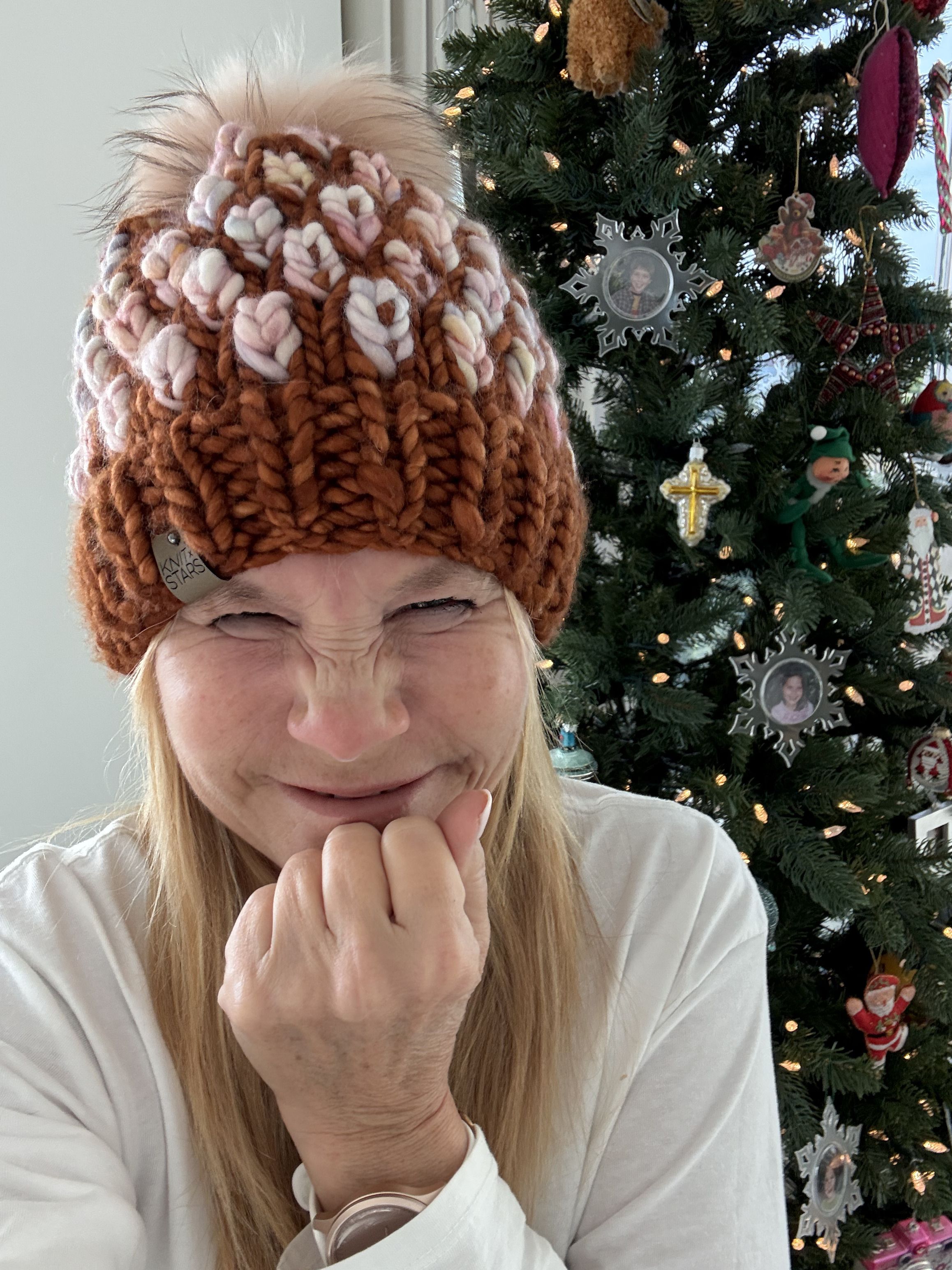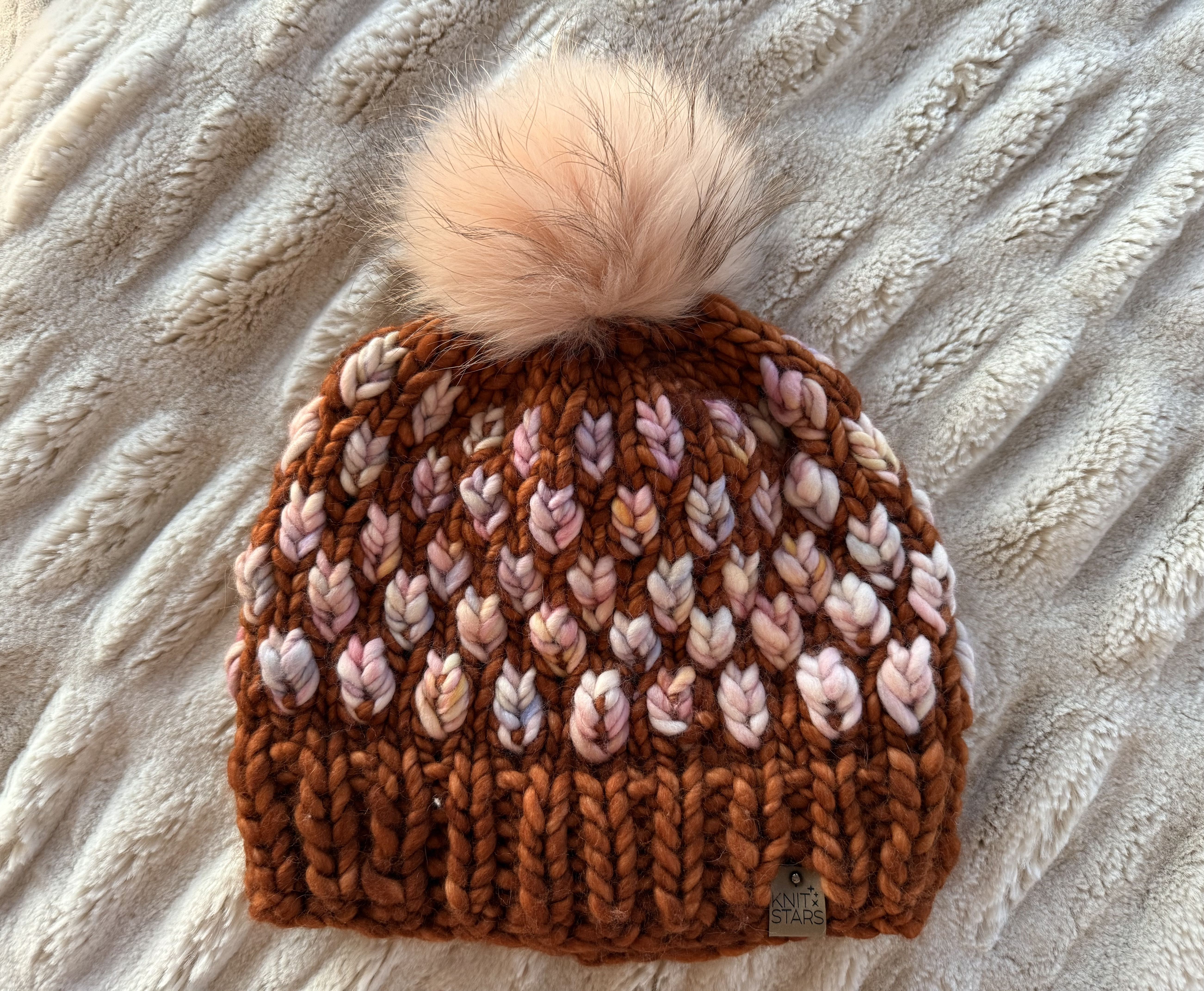 I finished “A New Leaf Beanie” by Karysha and posted on our Instagram @knitstars asking which pompom from my stash I should add. The overwhelming response was rust. But then…I found one more pompom hiding in my stash, and went with it!