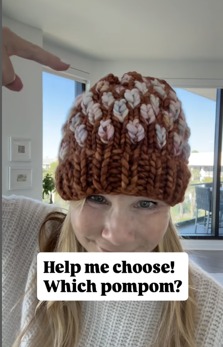 Thank you to everyone who weighed in. And since my pompom snaps in…I can always swap it out for the rust one later! Or as Patty Lyons suggested…go pom-less.