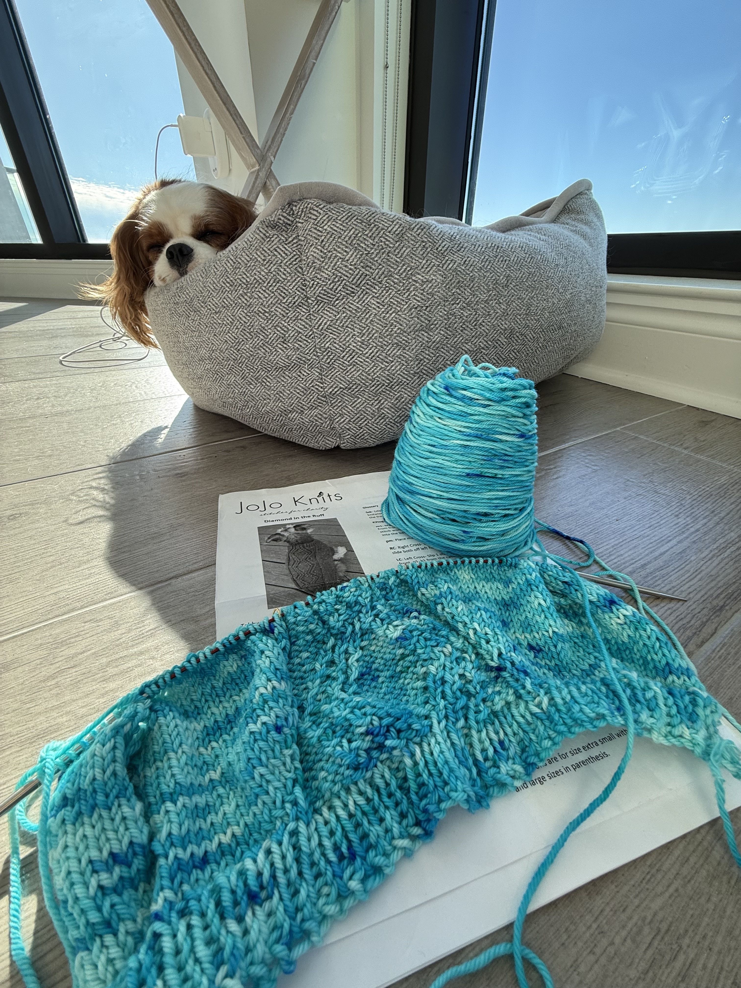 On my #7 needles: “Diamond in the Ruff” by Jojo Knits – my first sweater for Charles Barkley! 🐾